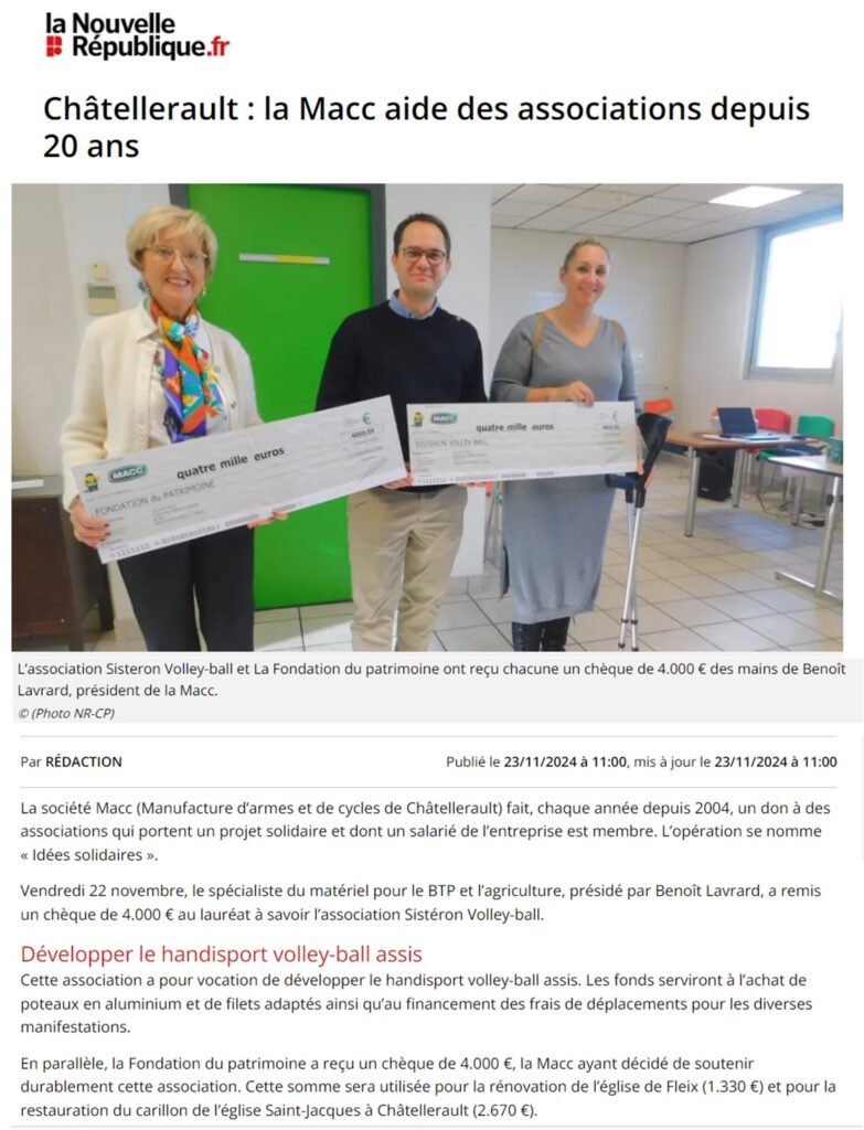Depuis 2024, 32 associations soutenues par la MACC : AUTISME VIENNE, ECLAIR, Enfants du Rio, L’OUTIL EN MAINS chauvigny (86) et ALBI (81), Les Virades de l’Espoir, FFK Vienne, Demain Antoigné, Centre social et Culturel de la Plaine d’Ozon, Santé sans Frontières, APEVO, Cavallino Rosso Club France, AMLO, Maison de l’abeille et de la nature, MIRA Europe, Avec Arthur, API, Handi soins, Club de Volley ball Aptésien, Un geste pour un sourire, Un roman d’Amour, Taekwondo Valvert, Eulavie, Cie des archers de l’Envigné, Ferme de l’Espoir, Renaissance Afrique, Basket de Haute Garonne, Partage avec les enfants du monde, CS Dissay, Phoenixdarts, Captain’Nemo, Sisteron Volleyball